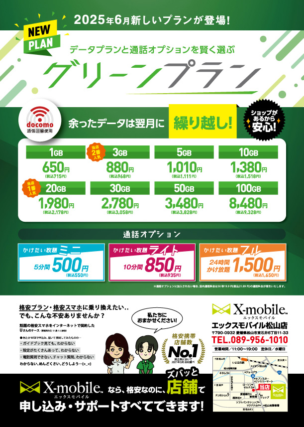 また、従来のプランでは5分間のかけたい放題がセットになっていましたが、『グリーンプラン』ではお客様のご利用状況に合わせて通話オプションを自由に選択できるようになりました。